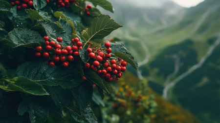 Close-up view of vibrant red berries nestled among lush green leaves, set against a serene mountain backdrop, showcasing nature's beauty and freshness.