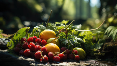 Fresh berry fruits in nature green background generated by artificial intelligence