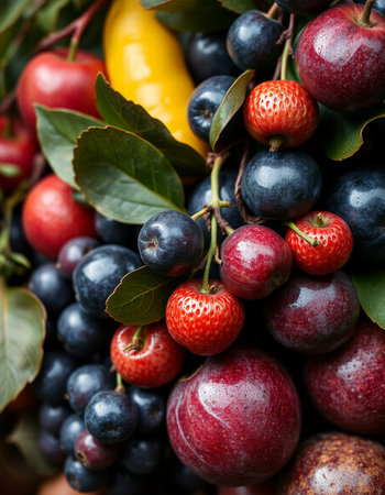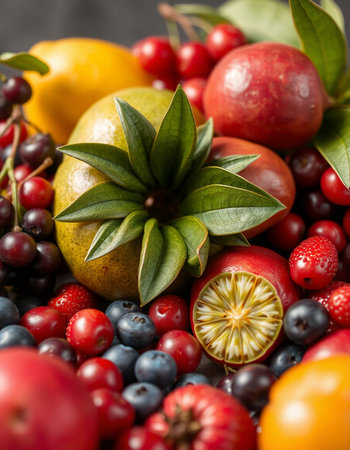 A close up of a bunch of different fruits and berries,.