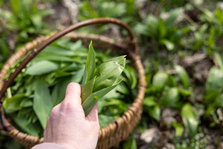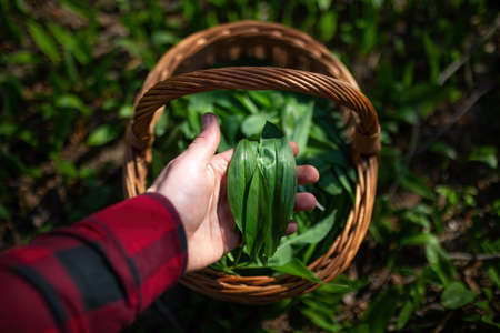 Mans hand holding green leaves of bear garlic above basket in spring forest. Person collecting green edible vegetable in nature. Close up of palm with organic food.