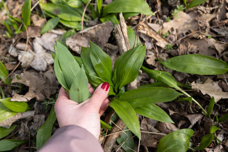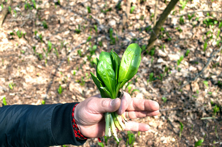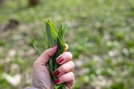 PIcking Fresh young wild garlic in the nearest forest