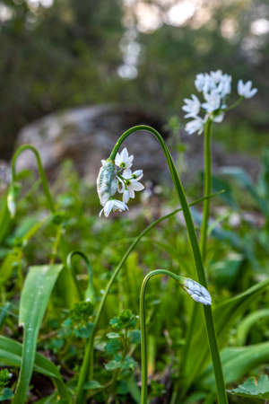 Wild garlic flowers growing in the spring forest. Ramson blossoms, seasonal background