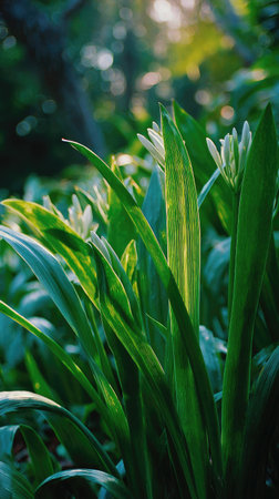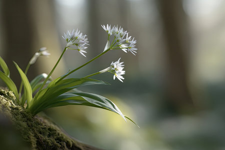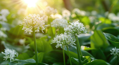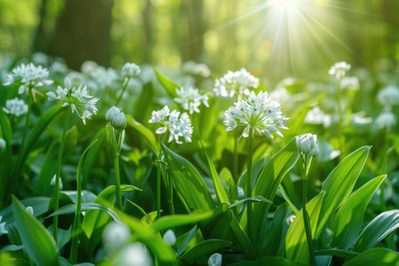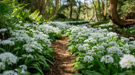 Bathed in warm sunlight, a tranquil forest awakens to the beauty of spring Delicate wild garlic flowers unfurl beneath towering trees, creating a vibrant carpet of white that dances in the gentle breeze As shafts of golden light pierce through the canopy, they illuminate the verdant undergrowth, casting an ethereal glow upon this serene scene of nature's renewal AI Generative