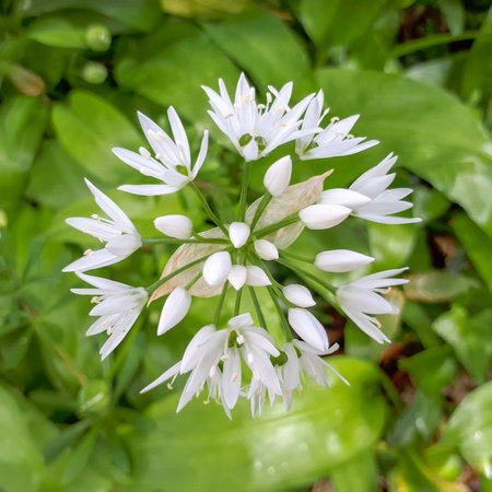 White wild garlic flowers highlighted against a green leaf background.