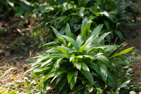 Wild garlic (Allium ursinum) green leaves in the forest. The plant is also known as ramsons, buckrams, broad-leaved garlic, wood garlic, bear leek or bear's garlic.