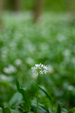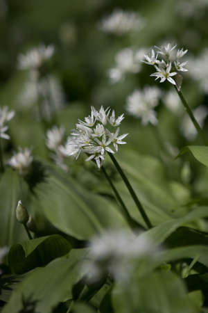 Flowering ramson, Allium ursinum. Blooming wild garlic plants in the woodland in spring - selective focus