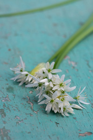 Allium ursinum wild bears garlic flowers in bloom, white ramsons buckrams flowering plants and green edible leaves on rustic vintage table