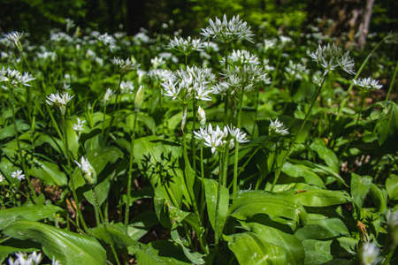 Wild garlic (Allium ursinum) blooming in the forest