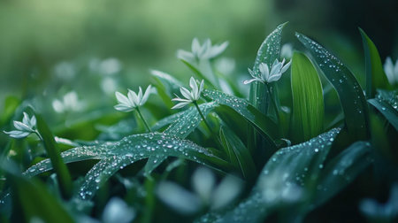 A bed of wild garlic leaves glistening with morning dew, with delicate white flowers just beginning to bloom
