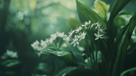 A close-up view of wild garlic flowers with a blurred background of green leaves and forest textures