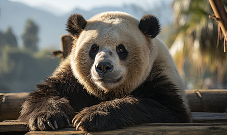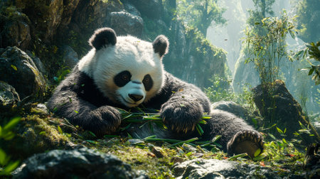 A breathtaking shot of a panda his natural habitat, showing his majestic beauty and strength.