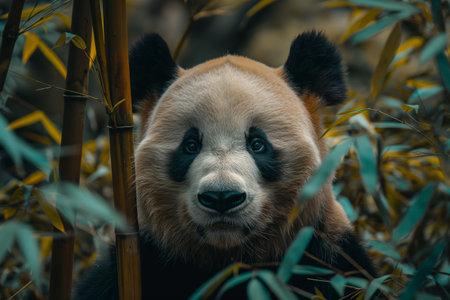Closeup Portrait of a Curious Panda Bear Surrounded by Lush Bamboo Leaves in Natural Habitat.