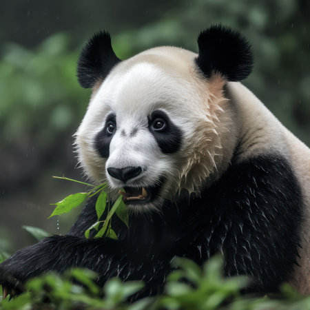 Portrait of a giant panda eating bamboo leaves in the jungle