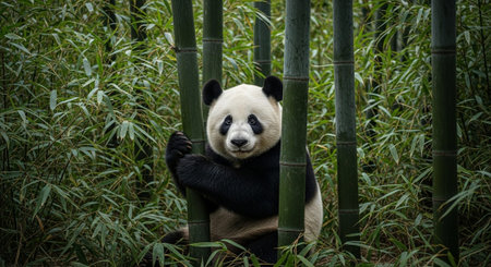 timeless panda photographed in a sitting pose in a bamboo grove, in a classic wildlife photography style, with soft natural tones, diffused daylight, high resolution
