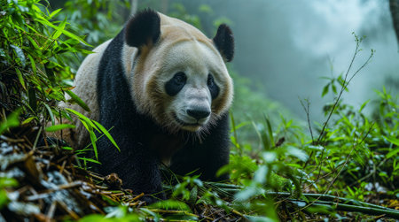 Giant panda resting in a bamboo forest, surrounded by mist and greenery, looking calm and content.