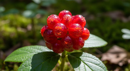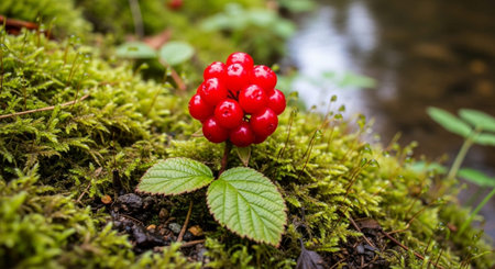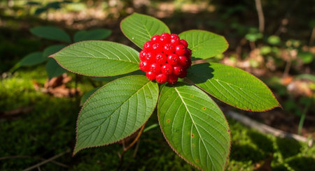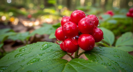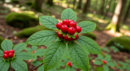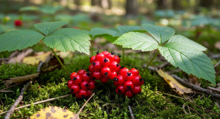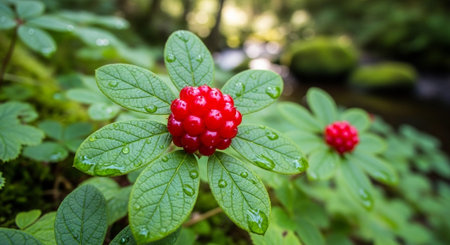 The Panax ginseng in light fog, dew on leaves, light soft diffused, three-quarter view