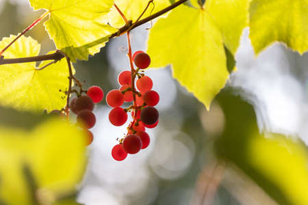 Vine shoots with red grapes. Morning summer sun. Bokeh effect. Europe, Poland, Mazovia.
