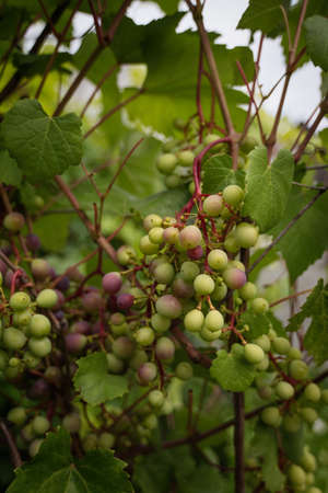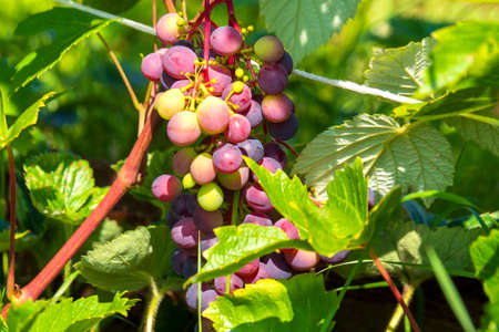 Clopse up of ripening grape fruit on vine branches in summer garden.