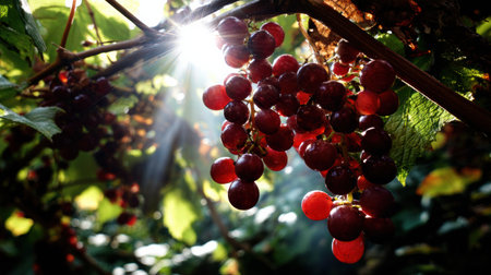 Ripe grapes on the vine. Purple grapes hanging on the vine in a vineyard at sunset, ready for harvest