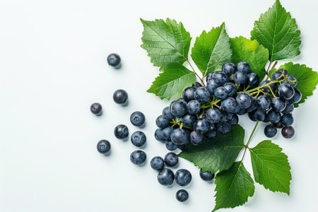 Bunch of black grapes with green leaves on a white background.
