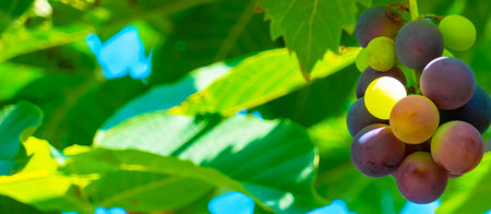 Bunch of grapes growing in vineyards, Green leaves background. Copy space. Grape harvest.