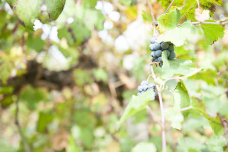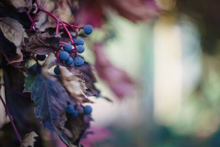 Autumn blue wild grape clusters, blurred soft focus. Copy space.
