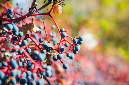 Close up of blue berries of grape woodbine with red stems in bright sunshine in autumn
