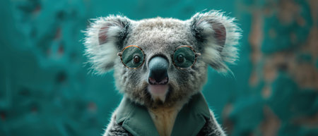Koala in green suit and sunglasses, teal background, stylish and cool