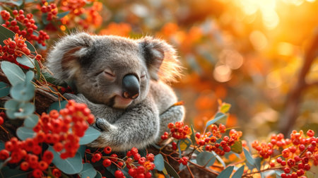 Cute koala bear sleeping on eucalyptus tree with red berries