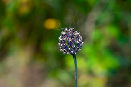 Close-up of an isolated purple inflorescence of globularia on an unfocused background