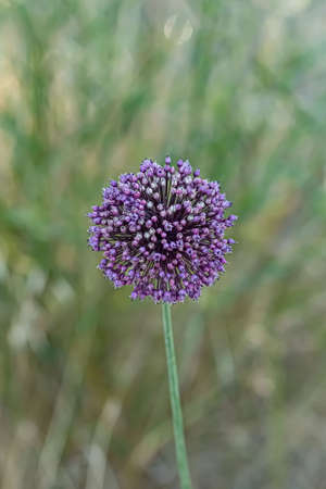 Close up of a purple allium flower in bloom on a meadow
