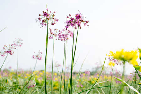Onion flower blooming in the field with cloudy sky background.