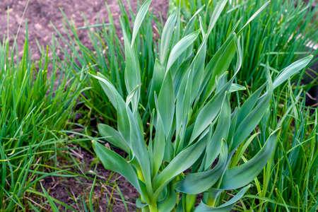 Leaves of onion and garlic in the garden, close-up.