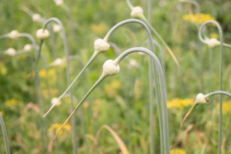 Stalk of the garlic grows on background of the green herb in garden