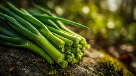 Freshly Harvested Green Onions on Mossy Log, Natural Food Presentation