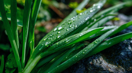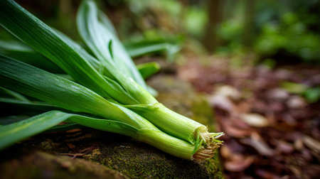 Fresh Spring Onions on Mossy Rock in Lush Green Forest