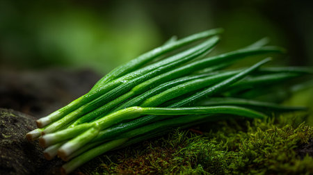 Freshly Harvested Green Onions Displayed on a Mossy Surface in Nature