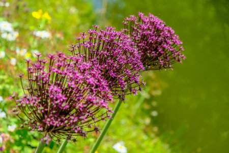 Beautiful view of purple and white allium flowers in the natural perennial garden