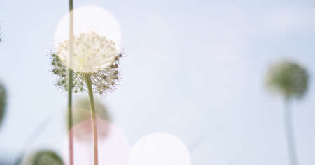 Beautiful White Allium circular globe shaped flowers blow in the wind. UHD