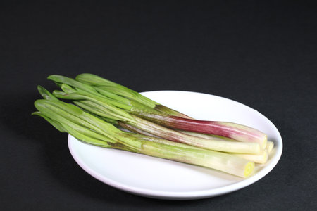 Green onions, on dark background, top view, space to copy text.