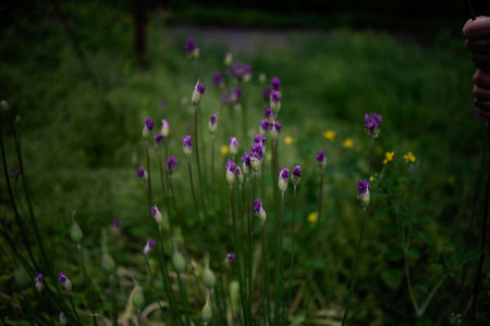 Woman's hand holds a bud of blooming purple ornamental onion Allium hollandica, Purple Sensation against the backdrop of green grass