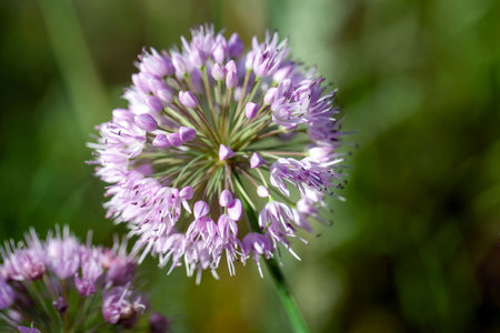 Blooming violet onion plant in spring garden. Flower decorative onion. Close-up of violet onions flowers on summer field.. Violet allium flower. Beautiful blossoming Garlic flowers