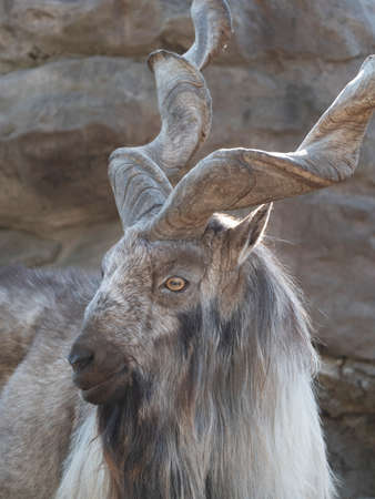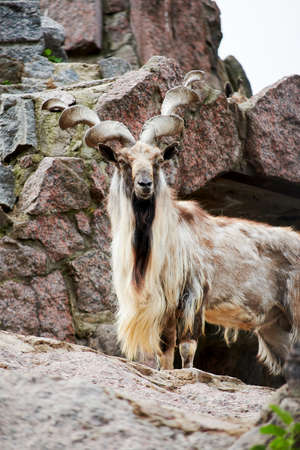 Beautiful mountain goat with helical long horns on the background of rocks.