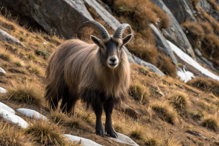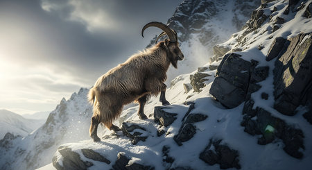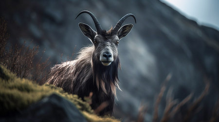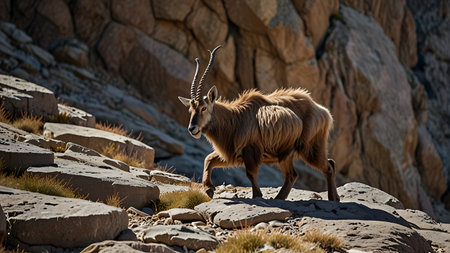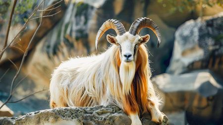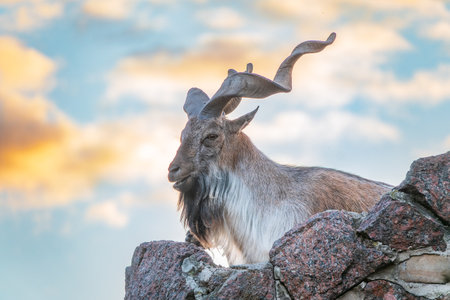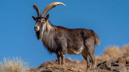 Majestic Markhor Goat a species of wild mountain goat standing on a rocky cliff with its impressive spiral shaped horns on display in its natural mountain habitat