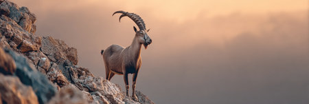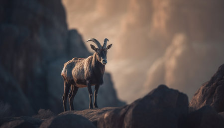 Ibex standing on mountain peak, silhouette against sunset sky generated by artificial intelligence