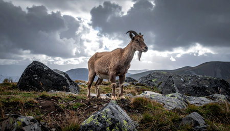 A majestic mountain goat stands proudly atop a rocky ridge, its silhouette defined against a dramatic, stormy sky. This resilient creature surveys its rugged, untamed domain, embodying the spirit of wildness, freedom, and survival in the face of natures power.