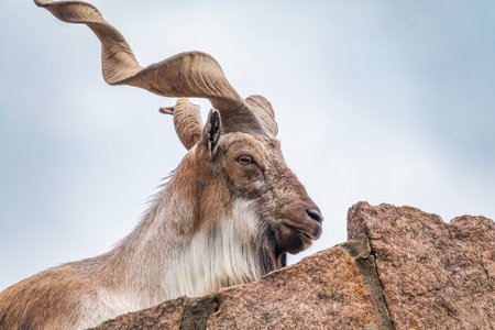 Mountain Markhor with twisted horns looks into the distance on top of a rock. Animals in the wild