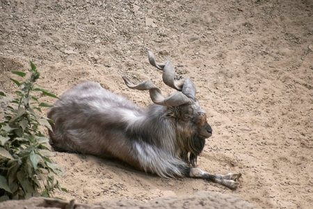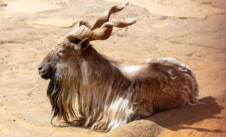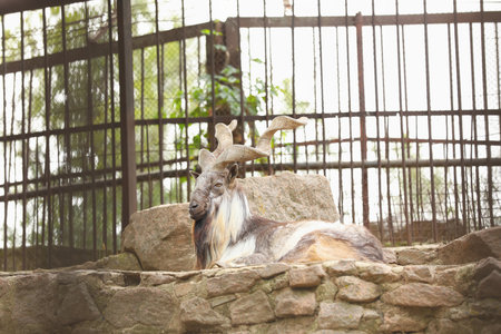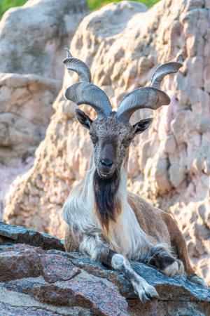 Beautiful markhor lying on stones in zoo enclosure