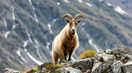 Mountain goat standing proudly on rocky terrain in a high-altitude environment with a breathtaking backdrop