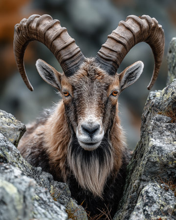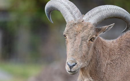 Mountain goat with large twisted horns in a spiral, close-up